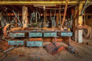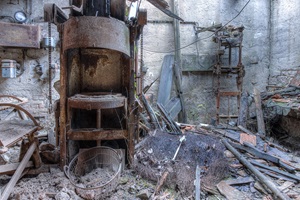 Diese total zerfallene Tonfabrik am Ortsrand war der vergessene Schandfleck in der ansonsten modern gestalteten Kleinstadt. Den vorderen Bereich mit den Töpfer-Waren konnten wir wegen dem immensen Wildwuchs nicht mehr erkennen, doch der Rest der bröckelnden Fabrik enttäuschte uns nicht. Nach dem Regen zuvor tropfte es überall aus dem maroden und teil-eingestürzten Gebälk unter den Resten des Daches. In der größten Halle mit den Transmissions-Antrieben schienen die Regeln der Physik nicht zu gelten. Ein einziger, dünner Holzbalken übernahm tapfer die Aufgabe, das Hallendach alleine zu stützen. Staunend standen wir vor den beiden großen Brennöfen-Kammern, von denen es zwei Blöcke gab. Die eher kleine Fabrik bot mehr Motive, als es der zerfallene Außenzustand vermuten ließ.